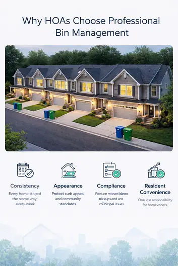 We provide structured, municipality-aligned curbside staging for managed communities that value consistency, appearance, and operational reliability.
